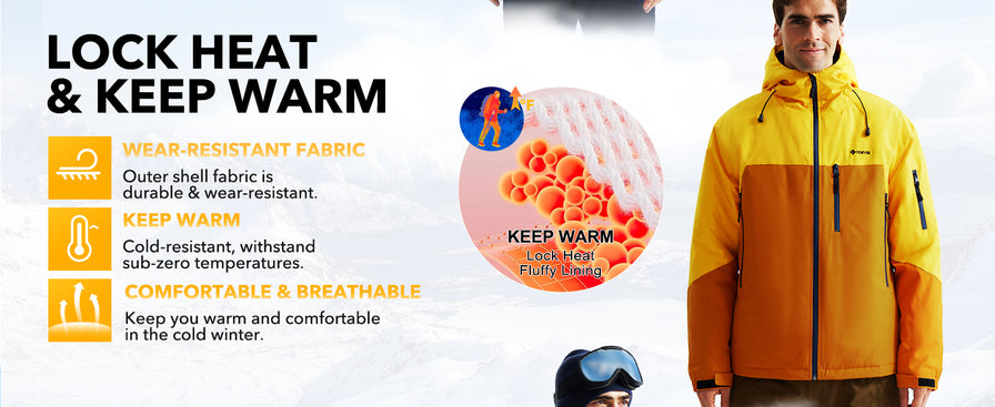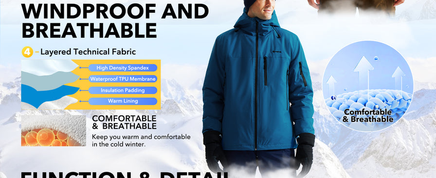 - Windproof Design: Made with premium windproof fabric, the ski jacket effectively blocks strong winds and keeps you warm. The powder skirt and adjustable elastic drawcord hem prevent cold wind and snow from entering the jacket, while the helmet-compatible adjustable hood blocks wind and rain without hindering your vision.